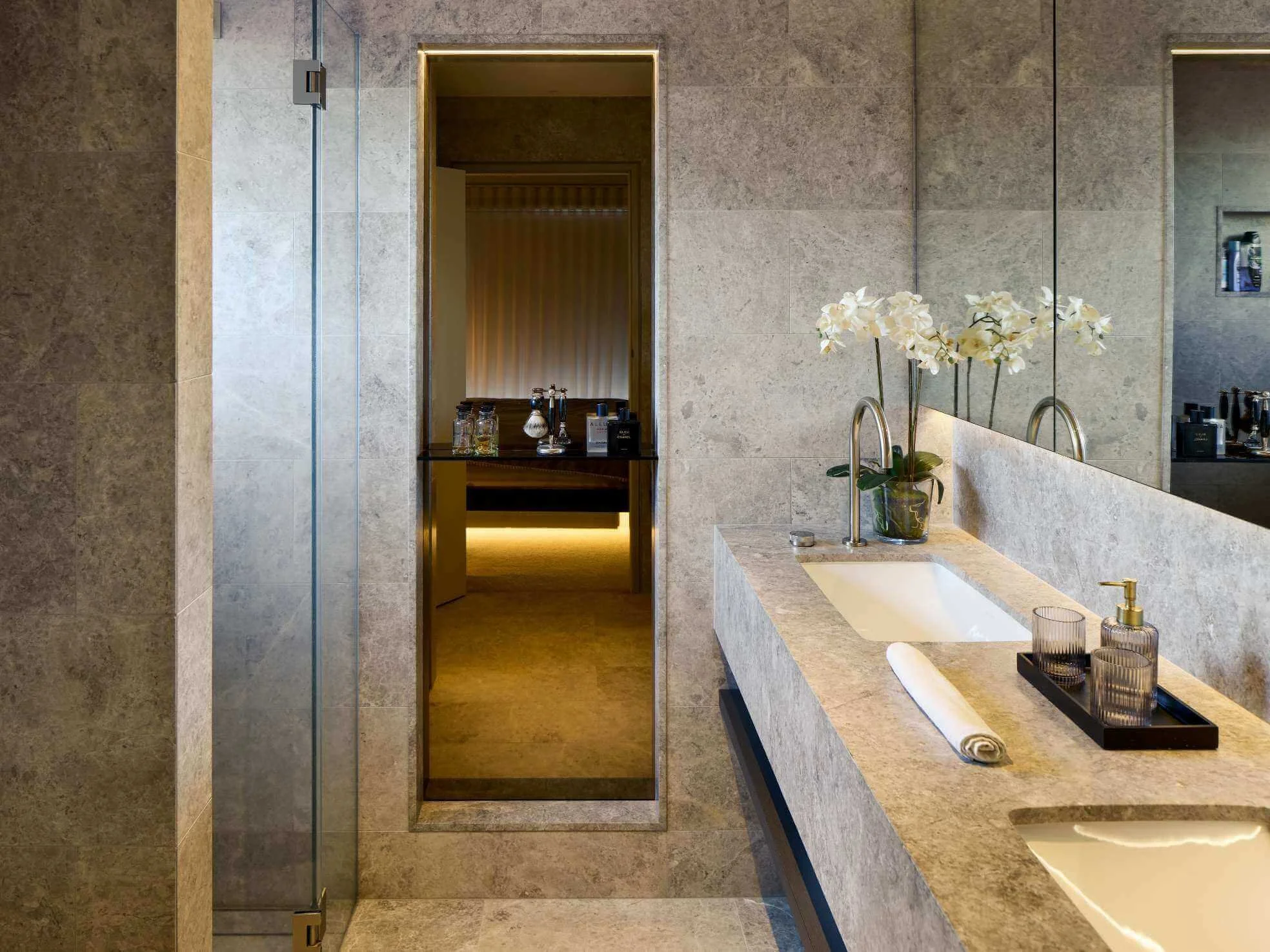 Bathrooms were finished with natural stone, providing durability and a refined aesthetic that complements the overall palette. Custom details played a key role in the build, including a bespoke granite dining table, designed and built by our team to anchor the dining space with a unique and lasting feature.